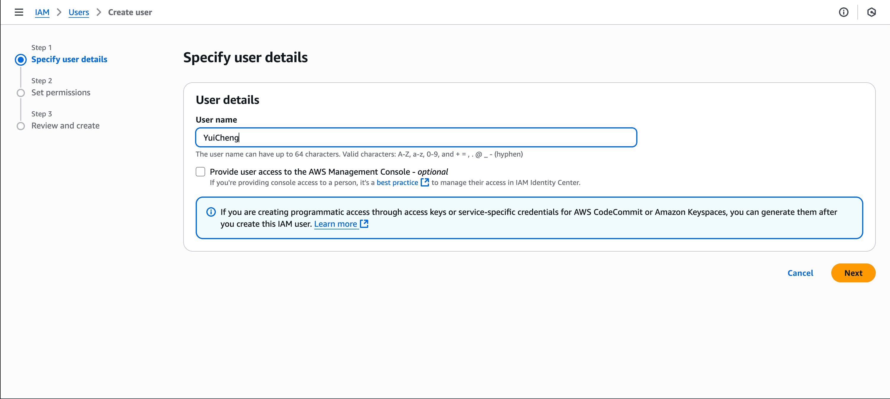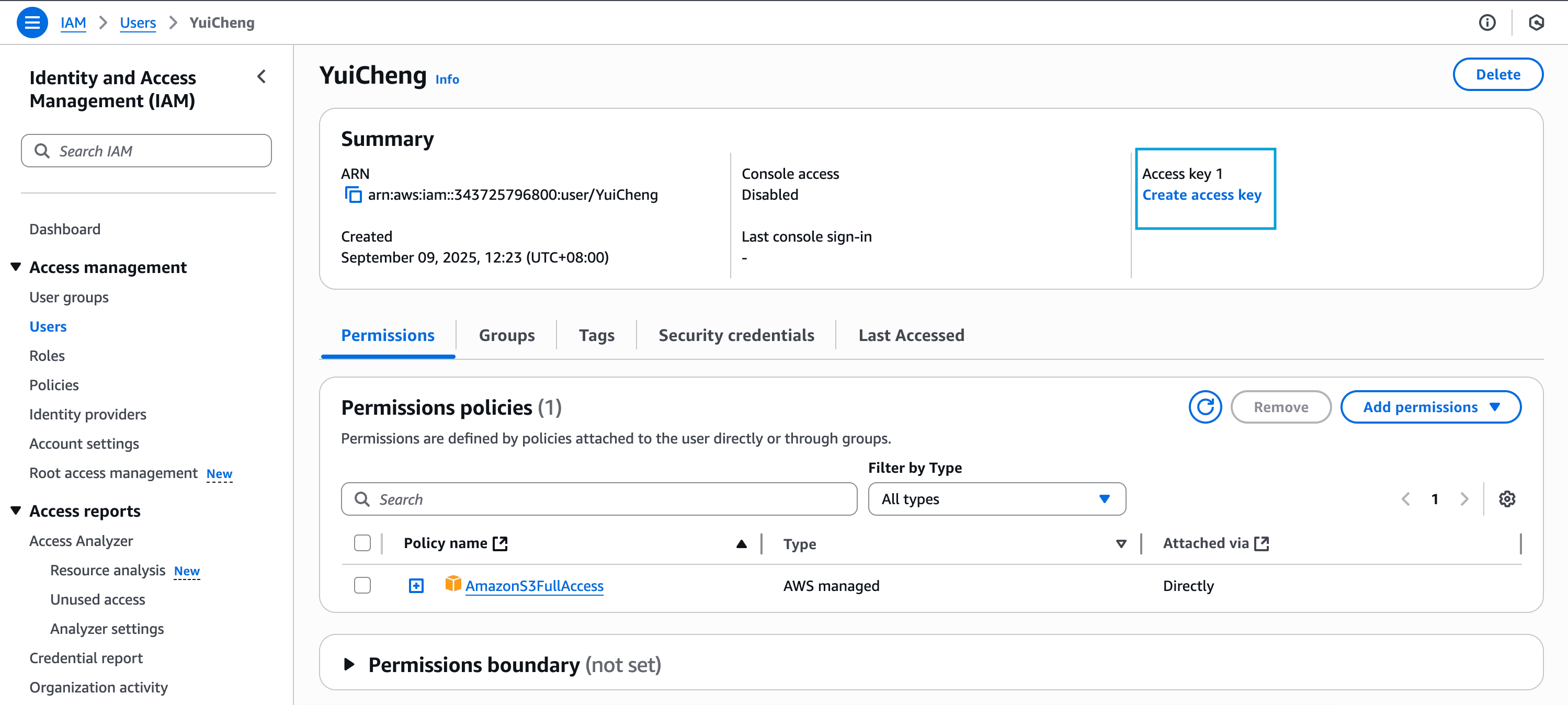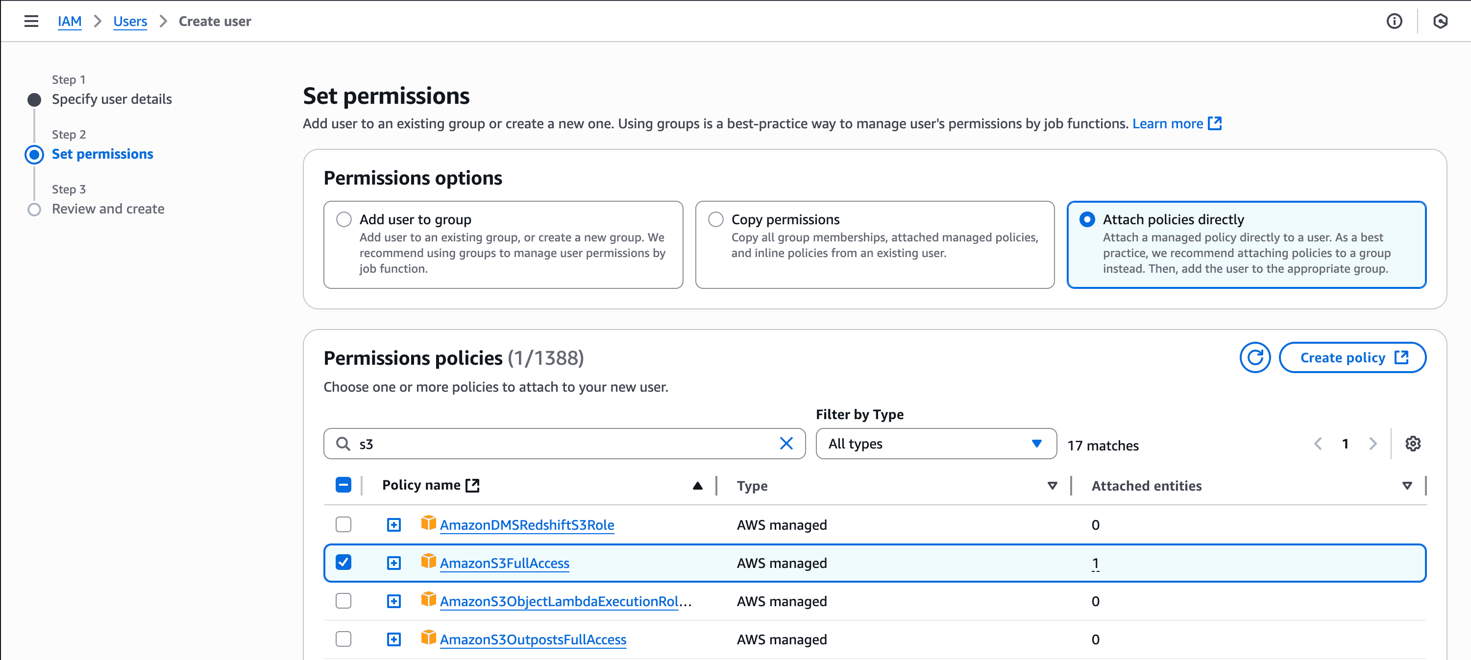 4 . 設定使用者的權限,AmazonS3FullAccess(擁有完整 S3 控制權限)