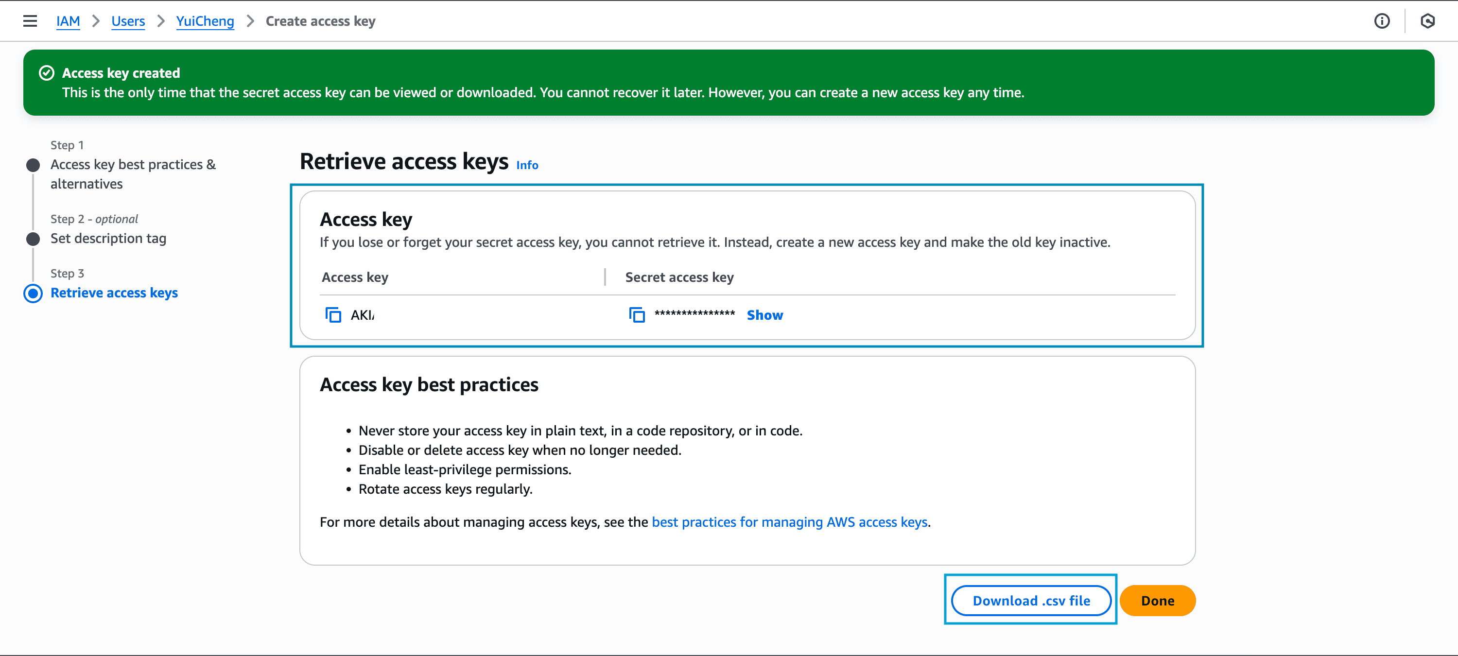 8 . 會取得一組 Access Key ID 與 Secret Access Key,需下載 .csv (只會產生一次)