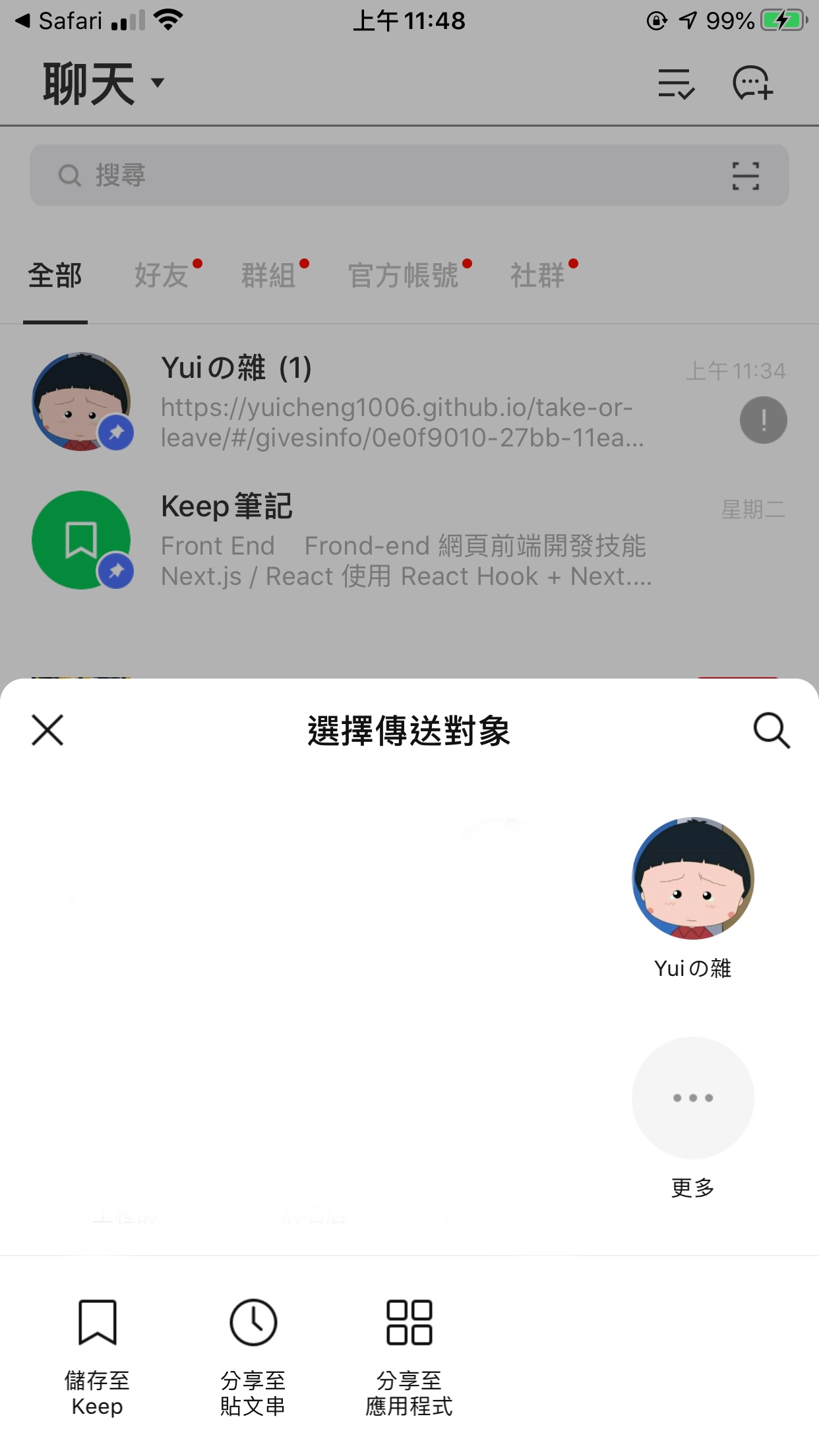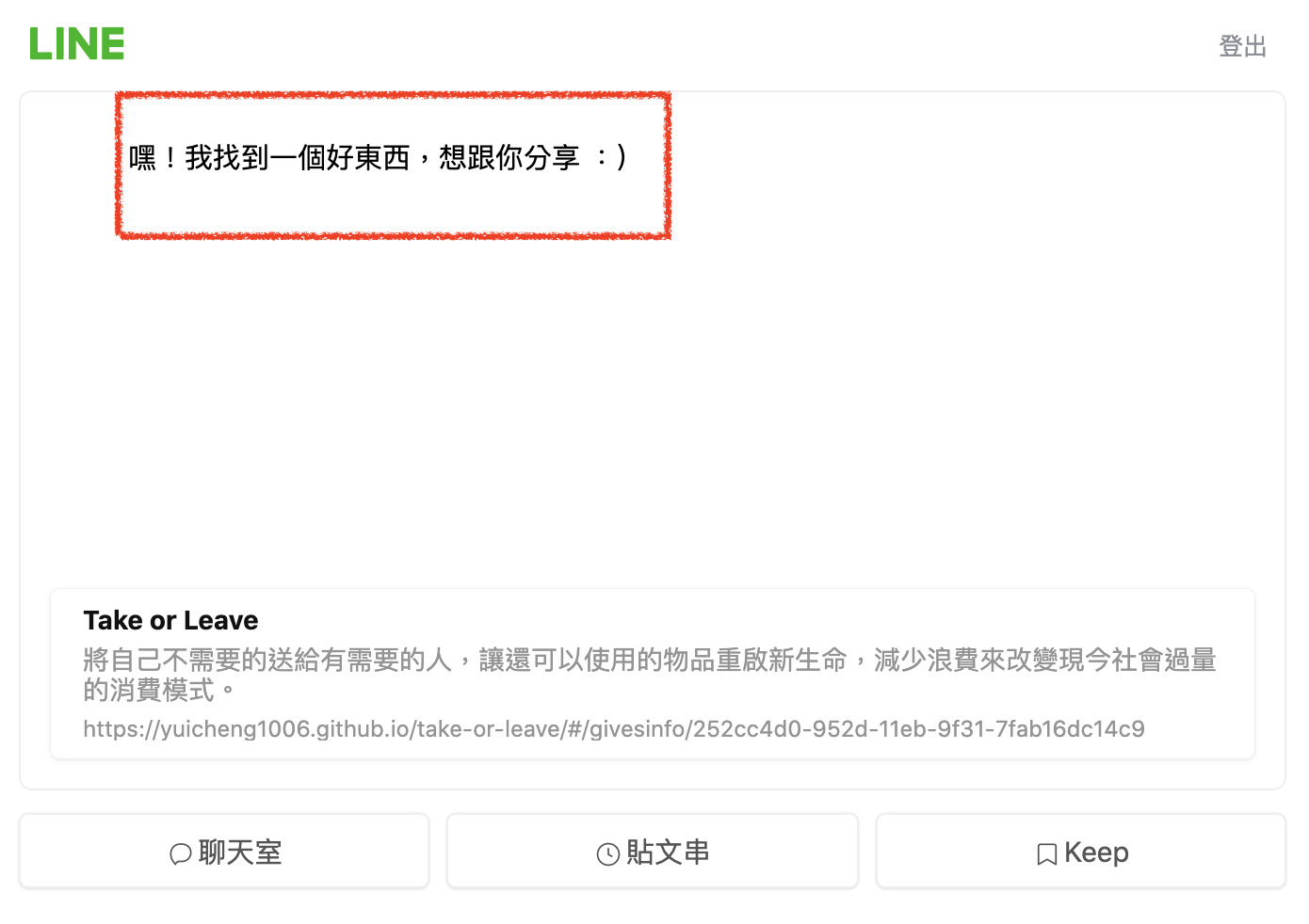 分享貼文的部分我就是照著官方文件走~ 因為使用自己的 icon + 動態路由 所以我是使用官方給的網址去做 不過網址需以 encodeURIComponent() 去編譯 URL 不然無法讓 LINE 成功的運行~ 這邊有文件可以查看 - HTML URL編碼參考